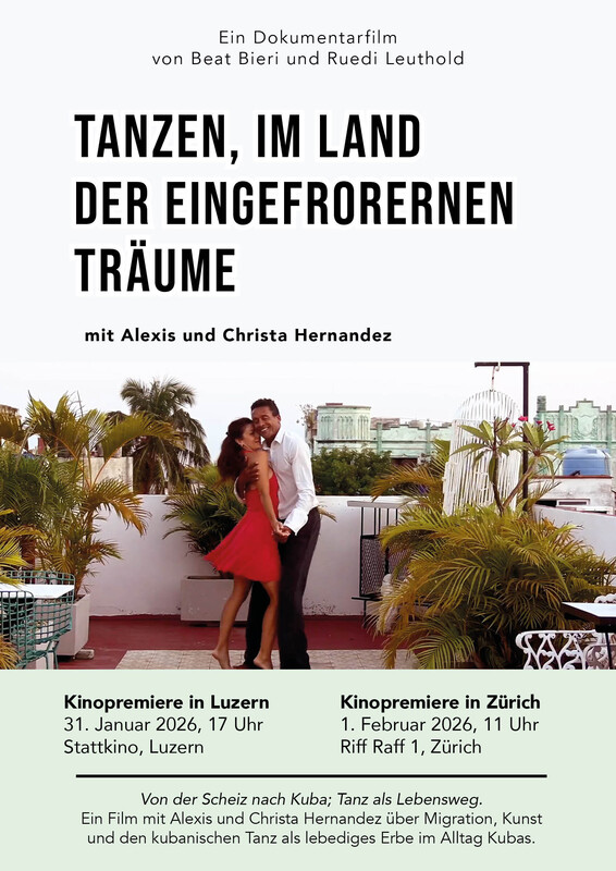 "Das Leben in Kuba ist schwierig geworden. Masshaft haben Menschen in den letzten Jahren die Insel verlassen. Eine Tanztruppe in Havanna, geführt von einem schweizerisch-kubanischen Paar bleibt. Die Pflege des afrikanischen Erbes, die Kultur der einstigen Sklaven, gibt Kraft. Ein Film mit Alexis und Christa Hernandez über Migration, Kunst und den kubanischen Tanz als lebendiges Erbe im Alltag Kubas." Filmpremiere in Luzern, Stattkino, 17 Uhr