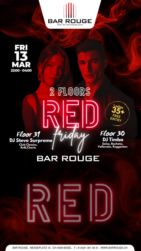 Erlebe hochwertige Cocktails und Drinks von charismatischen Bartendern mit Know-how gemixt in 105 Metern Höhe. Geniesse die ultimative Party auf 2 Floors Zeige uns deine Dance Moves im 31. Stock zu Club Classics, RnB & Charts und geniesse gemeinsam mit uns die atemberaubende Aussicht über ganz Basel. Oder schwinge im 30. Stock deine Hüften zu heissem, leidenschaftlichem und mitreissendem Salsa & Latin! Tanze mit uns durch die Nacht bis es hell wird. Join the club! https://eventfrog.ch/RedFriday13032026