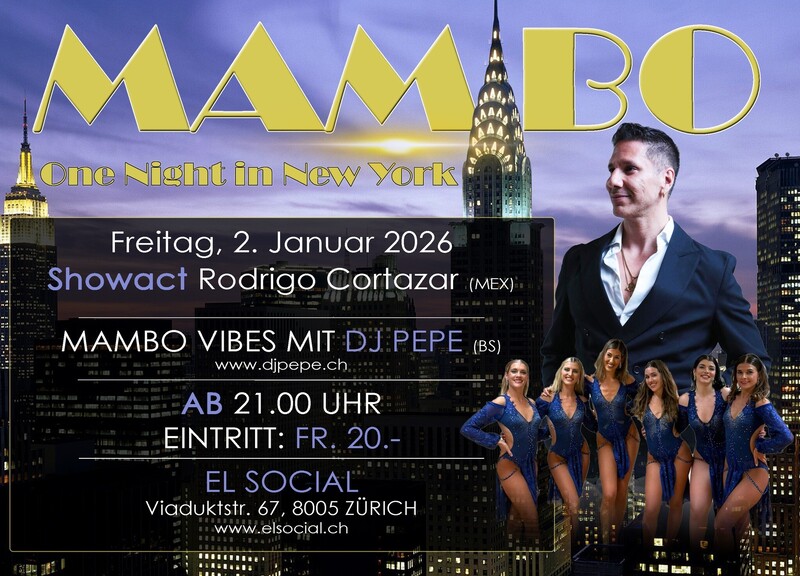 🗽 :: M A M B O :: – One Night in New York by DJ Pepe Erlebe eine einzigartige Mambo-Nacht mit echten New-York-Vibes im Herzen von Zürich – Nuyorican Feeling, Musikalität und Tanzkultur pur. 🔥 SOCIAL DANCING NON STOP 🔥 Die Tanzfläche gehört euch – von Anfang bis Ende! ✨ SHOWS: 💃 Rodrigo Cortázar (Mexiko) 🇲🇽 Special Guest auf Europa-Tour Rodrigo macht Halt in Zürich und präsentiert seine neueste Show. International anerkannter Tänzer, Performer und Dozent für Salsa New York Style / Mambo, bekannt für starke Musikalität, technische Präzision und tiefes Verständnis der afrokaribischen Tanzkultur. 💃 BailaRico Ladies Team by Vesna Eine kraftvolle, elegante und energiegeladene Performance mit Präzision, Ausdruck und starker Bühnenpräsenz. 🎶 Music by DJ Pepe Nuyorican Vibes • Puerto Rican Vibes • Old School & New School Mambo 📍 El Social Viaduktstrasse 67, 8005 Zürich 🎟️ Eintritt: CHF 20.–