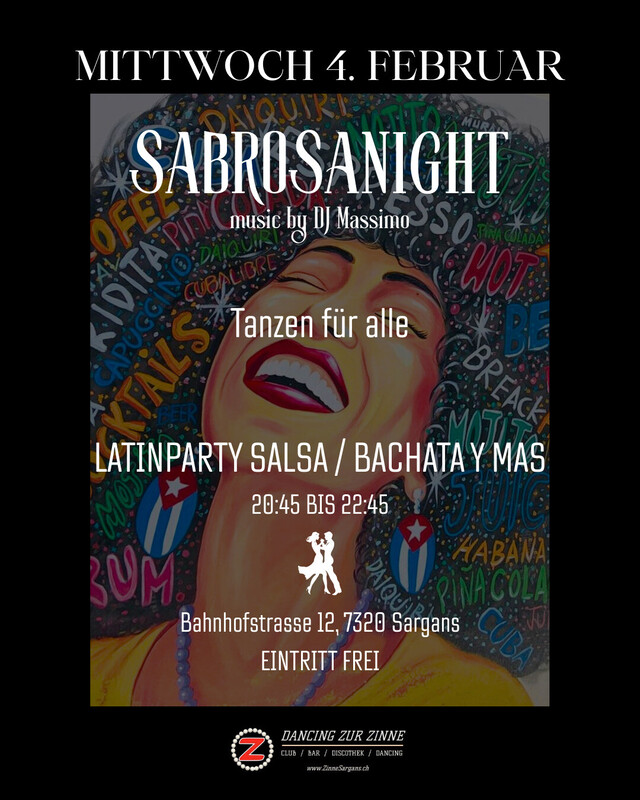 Sabrosanight - Die legendäre Latinparty in der Zinne! Bevor die Fasnacht so richtig loslegt, starten wir mit unserer Sabrosanight und legen mit einer unvergesslichen Latinparty los! Sei dabei am 04.02.2026, wenn wir in der Zinne die Tanzfläche zum Beben bringen. Erinnert ihr euch noch an die früheren Latinpartys in der Zinne? Jetzt ist es an der Zeit, die Erinnerungen aufzufrischen und die Party noch besser zu machen! Dieses Event wird euch in Tanzfreude versetzen. Lasst euch von DJ Massimo mitreissen, der mit seiner Musik eure Körper in Bewegung bringt. Verpasst nicht die Gelegenheit, Teil dieser unvergesslichen Nacht zu sein! Schau vorbei und feiere mit uns!