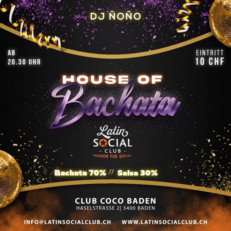 Herzlich willkommen bei Latin Social Club! Wir sind Veranstalter diverser Events für Liebhaber der latinoamerikanischen Musik/des latinoamerikanischen Tanzes im Aargau. 70% Bachata & 30% Salsa Zum Abschluss der Woche die heissen Rhythmen der lateinamerikanischen Musik nochmals erleben. Du wirst es spüren, ob an der Bar oder auf der Tanzfläche mit deinem Gegenüber, das geheimnisvolle, faszinierende Etwas, dass das HOUSE OF BACHATA ausmacht. Zudem heizt unser DJ dem Drang zu Tanzen ordentlich ein und sorgt dafür, dass der Club lebt!! In den schönen Räumlichkeiten des Clubs CoCo, im Gran Casino Baden, wird jedes Tanzfeeling noch verstärkt. Das Elegante Ambiente, das durchdachte Konzept und das Echtholzparket machen den Club CoCo zum perfekten Ort zum Tanzen. Euer Latin Social Club Team www.latinsocialclub.ch Eintritt nur Barzahlung möglich. https://latinsocialclub.ch