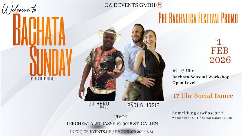 Lasst uns abtanzen und das Leben feiern am Sonntag den 1. Februar im Pivot in St.Gallen!! Pre Bachatica Festival Promo Workshop & Social Dance !!!! Tickets im Vorverkauf: https://eventfrog.ch/BachataSunday 16 Uhr Bachata Sensual Workshop mit Pädi & Josie ab 17 Uhr Social Dance mit DJ Hero 80% Bachata & 20% Salsa 1 Workshop 15 CHF/ Eintritt: 10 CHF Anmeldung erwünscht!! Zahlungsmöglichkeit: Twint oder Cash. Keine Kartenzahlung möglich!! Workshop Anmeldung und Infos: Phone 078 209 93 31 oder per Mail an info@ce-events.ch Parkplätze vor dem Haus und weitere an der Lerchentalstrasse 21 beim Stoffwechselzentrum Gästeparkplätze, weitere Gästeparkplätze auf dem Kiesplatz bei Altrimo und Stoffwechselzentrum!! Wir freuen uns auf schöne Tanzstunden mit euch!! www.ce-events.ch