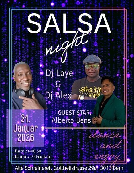Salsa night in der Alten Schreinerei Am Samstag den 31. Januar 2026 ist die nächste Salsa night. Wir tanzen auch im neuen Jahr Salsa in der Alten Schreinerei. 21 Uhr beginnt ein wunderbarer Abend mit Salsa von Dj Laye und Dj Alex. Kommt in die schöne Locationon der Alten Schreinerei in Bern und tanzt zusammen zu guter Musik. Als Guest Start präsentiert uns Alberto Bens zwei seiner Lieblingslieder. Eintritt Party: 10 Franken. Location: ALTE SCHREINEREI, Gotthelfstrasse 29a, 3013 Bern facebook, instagram: kizomba bern