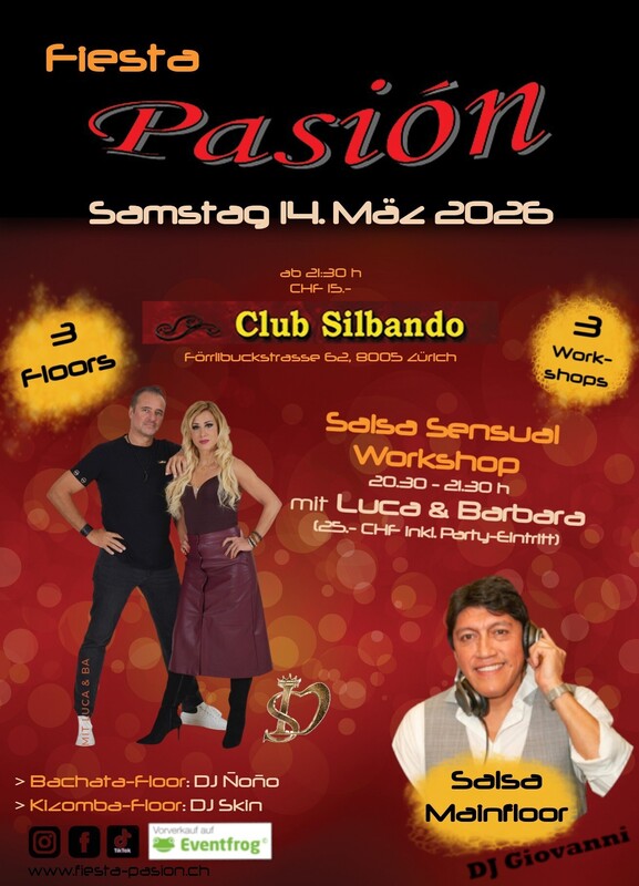 Lerne Salsa Sensual Figuren mit Luca & Barbara (SalsaLuca) und tanze diese gleich anschliessend an der Fiesta Bachata ab 21:30 Uhr mit 3 Floors (u.a. mit Salsa Floor by DJ Giovanni)! Workshop inkl. Party-Eintritt Fiesta Bachata für 25.- CHF Abendkasse oder Vorverkauf via Eventfrog: https://eventfrog.ch/de/p/kurse-seminare/musik-tanz/salsa-sensual-workshop-mit-luca-barbara-salsaluca-7421654914873457981.html https://eventfrog.ch/de/p/kurse-seminare/musik-tanz/salsa-sensual-workshop-mit-luca-barbara-salsaluca-7421654914873457981.html