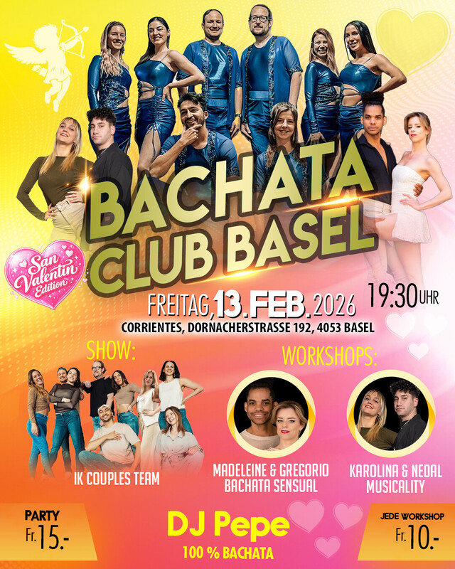 💖 BACHATA CLUB BASEL mit DJ PEPE – Valentins-Special 💖 📅 Freitag, 13. Februar 2026 📍 Corrientes, Dornacherstrasse 192, Basel Feiere den Valentinstag auf der Tanzfläche! 💃🕺 Ob als Paar oder solo – diese Nacht steht ganz im Zeichen von Romantik, Verbindung und sinnlichen Bachata-Beats. Lass dich von der Musik tragen, geniesse die Atmosphäre und erlebe einen Abend voller Leidenschaft und Tanzfreude. 💘 PROGRAMM 🕢 19:30–20:30 Uhr – Bachata Musicality Workshop mit Karolina & Nedal 🕣 20:30–21:30 Uhr – Bachata Sensual Workshop mit Madeleine & Gregorio 🎶 Ab 21:30 Uhr – Party mit den besten Bachata-Songs 🎧 DJ Pepe ✨ Mitternacht-Highlights: 🔥 IK-Couples Team Wir erwarten Bachateras & Bachateros aus Frankreich, Deutschland & der Schweiz! 🎟️ Eintritt: Party CHF 15.– 🩰 Workshop: CHF 10.– pro Workshop 💕 Liebe, Musik & Bachata – der perfekte Valentinsabend!