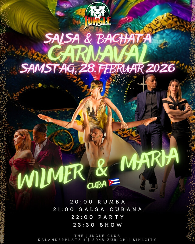 SAMSTAG, 28. FEBRUAR 2026 WILMER & MARIA CARNAVAL SPECIAL 🌎 WORLD CLASS SALSA IN ZÜRICH! Sowas erlebt man nicht alle Tage. Wilmer & Maria kommen zu uns! Hier geht es nicht nur um Schritte, sondern um pure Energie und Weltklasse-Niveau🔥 Wir bringen den The Jungle Club zum Beben. Wilmer & Maria performen ihre aktuelle Show, Gänsehaut garantiert😍 Nach den Workshops gehört die Tanzfläche euch. Wir feiern gemeinsam mit den Stars🤩 Eintritt 20 CHF - Ein Ticket für alles⚡️ Timetable: 19:45 Open Door 20:00 Rumba Workshop 21:00 Salsa Cubana Workshop 22:00 Party 23:30 Show - Wilmer & Maria www.thejungleclub.ch