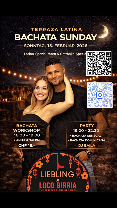 🌴 Terraza Latina – Bachata Sunday 🌴 🗓 Sonntag, 15.02.2026 Programm 🕕 18:00 – 19:00 ✨ Bachata Workshop mit Anita & Salem 🎟 Preise Workshop: CHF 15.– 🕖 19:00 – 22:30 🎧 Bachata Party 🎶 DJ Baila 🔥 Bachata Sensual 🔥 Bachata Dominicana 💃 100 % Bachata 📍 Location Lounge – Zürcherstrasse 133 8952 Schlieren ⸻ 🍽️ Essen Wer früher kommen möchte, kann vor dem Workshop essen. Das Restaurant Liebling / Loco Birria ist geöffnet. 👉 Speisekarte: liebling.swiss