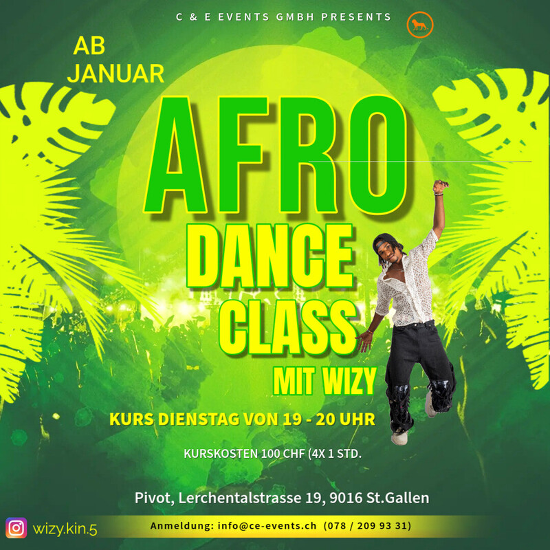 Neu in St.Gallen Afro Dance Class!!! Afro Dance ist vom traditionellen afrikanischen Tanz geprägt und inspiriert und vermischt sich mit modernen Tanzelementen. Es ist ein ausdrucksstarker und sehr rhythmischer Tanzstil, in dem Hüft- und Schulterbewegungen, Spannung und Entspannung, Isolation und Geschmeidigkeit im Vordergrund stehen. Die kraftvollen Bewegungen aus der Mitte heraus geben das Gefühl, mit der Musik und dem Körper eins zu sein. Kurs: 4x 1 Std. Kurskosten: 100.-- (4x) Wichtig: Anmelden unter: info@ce-events.ch oder Phone 078 209 93 31 Wir freuen uns auf schöne Tanzstunden mit Euch!!! C & E Events GmbH / Pivot https://ce-events.ch