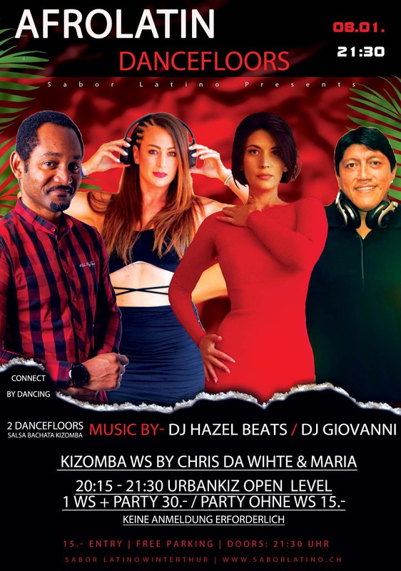 Die erste Kizombaparty im Sabor Latino im neuen Jahr mit 2 Dancefloors und Workshop. Kizombafloor: DJ Hazel Beats Latinfloor: DJ Giovanni Workshop: Chris Da White & Maria 20:15 - 21:30 Urban Kiz WS + Party 30.- Keine Anmeldung erfordlich Only Party: 15.- Für diese Party und den Workshop gilt 2G+ (geimpft oder genesen und getestet) Wenn die Impfung oder Genesung weniger als 120 Tage zurück liegt braucht es keinen Test. Alle Infos: https://saborlatino.ch/aktuelle-coronaschutzmassnahmen-im-sabor-latino/ In der Stadt gibt es Testzelte in denen man sich auch spontan bis nach Mitternacht testen lassen kann. Genügend freie Parkplätze vor dem Club. Es darf auf allen freien Flächen auf dem Gelände geparkt werden. Nur die Plätze vor den beiden Häusern links nach der Einfahrt in die Werkstrasse und die mit “Borsalino” gekennzeichneten Plätze visavis vom Sabor Latino sind tabu. Free Parking vor dem Club www.saborlatino.ch