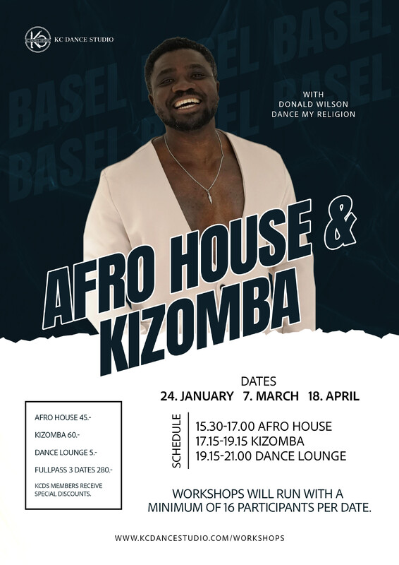 Join Donald Wilson for AfroHouse & Kizomba Workshops in Basel! Experience top-quality dance instruction with internationally renowned artist Donald Wilson. Enjoy small groups, personal corrections, solid technique and plenty of fun to take your dancing to the next level. Dates: 24.01.26 · 07.03.26· 18.04.26 Schedule 15:30–17:00 AfroHouse 17:15–19:15 Kizomba 19:15–21:00 Dance Lounge (open to everyone; pre-sale only) Workshops and the Dance Lounge run with a minimum of 16 participants per date. Registration closes 5 days before each event. Pricing AfroHouse: Extern 45.– / Members 40.– Kizomba: Extern 60.– / Members 55.– Dance Lounge: 5.– Full Pass (all 3 dates): Extern 280.– / Members 250.– https://kcdancestudio.com/event/afrohouse-kizomba-workshops/