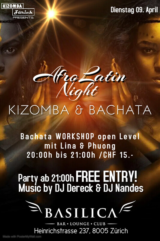 AFROLATIN NIGHT - Kizomba & Bachata DIENSTAG 09. April BACHATA WORKSHOP open level mit LINA & PHUONG /CHF 15.- - MUSIC by DJ Dereck & DJ 'Nandes Workshop from 20:00h - 21:00h Party from 21:00h - open end "Das BASILICA ist am Dienstag schon ab 17:00h für alle geöffnet und der Eintritt ist frei". _____________________________ BASILICA - BAR * LOUNGE * CLUB Heinrichstrasse 237 8005 Zürich