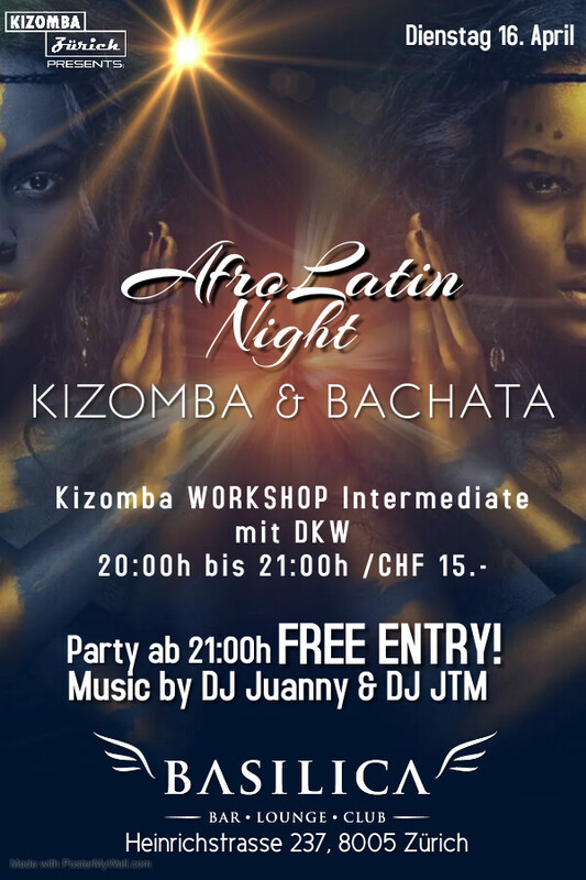AFROLATIN NIGHT - Kizomba & Bachata DIENSTAG 16. April - KIZOMBA WORKSHOP Intermediate mit DKW /CHF 15.- - MUSIC by DJ Dereck & DJ 'Nandes Workshop from 20:00h - 21:00h Party from 21:00h - open end "Das BASILICA ist am Dienstag schon ab 17:00h für alle geöffnet und der Eintritt ist frei". _____________________________ BASILICA - BAR * LOUNGE * CLUB Heinrichstrasse 237 8005 Zürich https://www.facebook.com/events/296977900107316