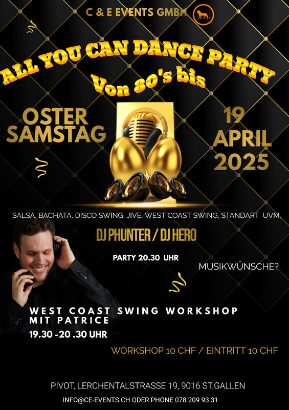 Lasst uns abtanzen und das Leben feiern am Oster Samstag den 19. April im Pivot in St.Gallen !!! Zum reinschnuppern West Coast Swing Open Level Workshop mit Patrice von 19.30 – 20.30 Uhr. Dieser vielseitige Paartanz aus den USA kombiniert fließende Bewegungen mit verschiedenen Musikstilen – von Swing und Blues bis hin zu Pop und Rock. Es wird ab ende April Kurse geben mit Patrice (Nur mit Voranmeldung) !!! Workshop 10 CHF / Party: 10 CHF Eintritt Party ab 20.30 Uhr mit DJ Phunter und DJ Hero Workshop Anmeldung und Infos: Phone 078 209 93 31 oder per Mail an info@ce-events.ch Wir starten ab dem 29. April einen West Coast Swing Kurs mit Patrice!! Nur mit Voranmeldung. Dieser vielseitige Paartanz aus den USA kombiniert fließende Bewegungen mit verschiedenen Musikstilen – von Swing und Blues bis hin zu Pop und Rock. Wir freuen uns auf einen schönen Abend mit Euch! C & E Events GmbH/Pivot https://ce-events.ch