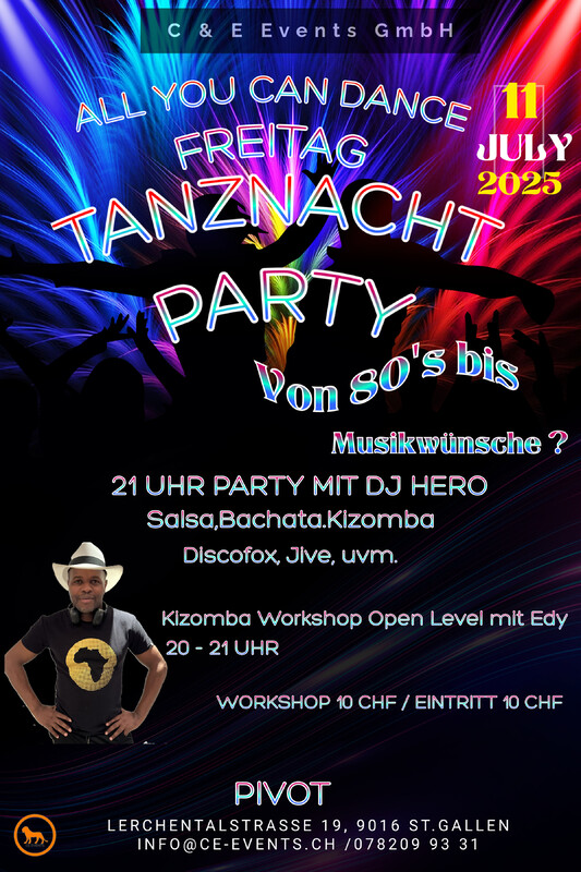 Lasst uns abtanzen und das Leben feiern am Freitag den 11. Juli im Pivot in St.Gallen !!! Kizomba Workshop Open Level mit Edy von 20 - 21 Uhr Workshop 10 CHF / Eintritt: 10 CHF Party ab 21 Uhr mit DJ Hero Infos: Phone 078 209 93 31 oder per Mail an info@ce-events.ch Wir freuen uns auf einen schönen Abend mit Euch! C & E Events GmbH/Pivot www.ce-events.ch
