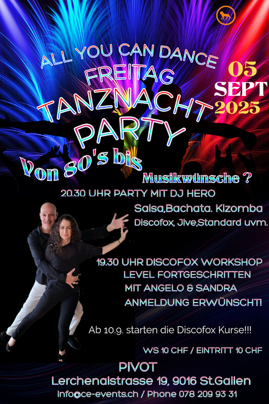 Lasst uns abtanzen und das Leben feiern am Freitag den 5.September im Pivot in St.Gallen!! Discofox Workshop Level Fortgeschritten mit Angelo & Sandra von 19.30 – 20.30 Uhr Im Discofox hat Angelo einige Titel gewonnen, darunter Weltmeister, Vize-Weltmeister und Europameister. Des Weiteren ist er Choreograf und Trainer. Workshop 10 CHF / Eintritt: 10 CHF Party ab 20.30 Uhr mit DJ Hero Infos: Phone 078 209 93 31 oder per Mail an info@ce-events.ch Wir freuen uns auf einen schönen Abend mit Euch! C & E Events GmbH/Pivot www.ce-events.ch
