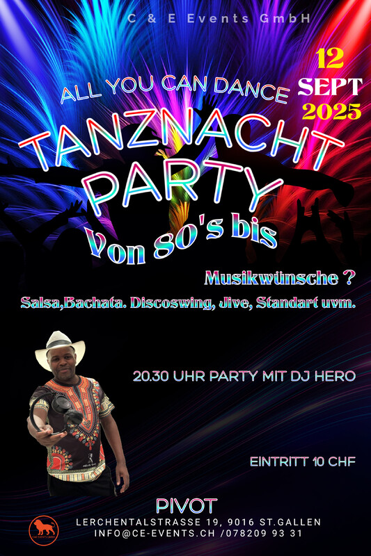 Lasst uns abtanzen und das Leben feiern am Samstag den 12. Sepzember im Pivot in St.Gallen!!! ALL YOU CAN DANCE PARTYNACHT Party ab 20.30 Uhr mit DJ Hero mit Salsa, Bachata, Discofox, Jive, Cha Cha Cha uvm. Party: 10 CHF Eintritt Infos: Phone 078 209 93 31 oder bper Mail an info@ce-events.ch Wir freuen uns auf einen schönen Abend mit Euch! C & E Events GmbH/Pivot