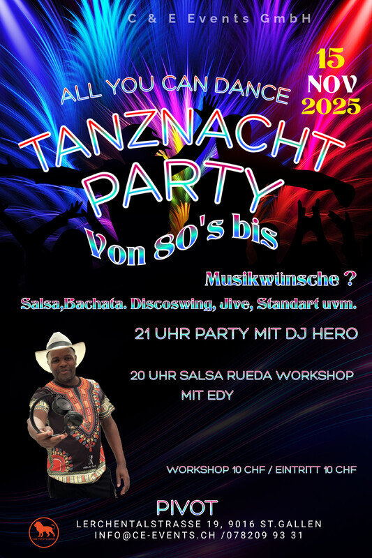 Lasst uns abtanzen und das Leben feiern am Freitag den 9. Mai im Pivot in St.Gallen!!! ALL YOU CAN DANCE PARTYNACHT Salsa Rueda Workshop mit Edy um 20 Uhr!!! Workshop 10 CHF / Party: 10 CHF Eintritt Party ab 21.00 Uhr mit DJ Hero Zahlungsmöglichkeit: Twint oder Cash. Keine Kartenzahlung möglich!! Infos: Phone 078 209 93 31 oder per Mail an info@ce-events.ch Wir freuen uns auf einen schönen Abend mit Euch! www.ce-events.ch