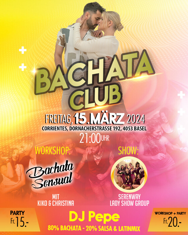 BACHATA CLUB Basel mit DJ Pepe Freitag, 15. März 2024 2024 starten wir mit einer neuen Bachata Party im Corrientes, Basel. Workshop BACHATA SENSUAL mit Kiko und Christina startet um 21:00 Uhr bis 22:00 Uhr. Danach ist Party mit dem besten Bachata Songs. Um Mitternacht zeigen wir die Bachata-Show von Serenway Lady Show Group. Wir freuen uns auf zahlreiche Bachateras & Bachateros aus Frankreich, Deutschland und der Schweiz. Eintritt Party: Fr. 15.- Party und Workshop: Fr. 20.- Corrientes Dornacherstrasse 192 4053 Basel