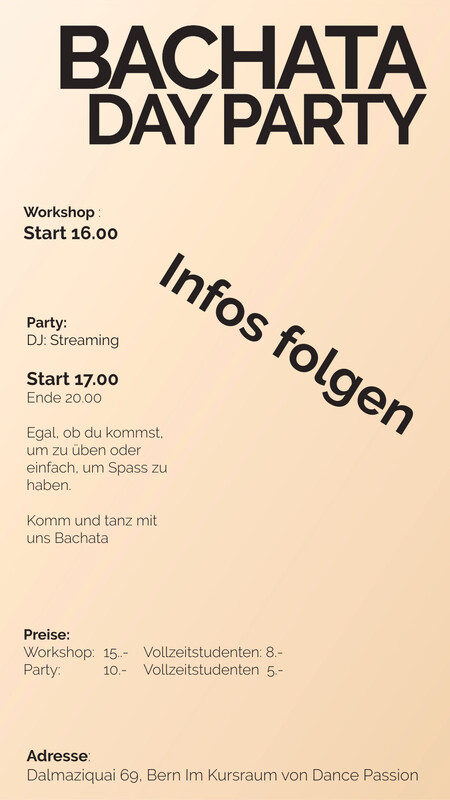 Bachata Day Party Infos folgen Preise: Workshop: 15..- Vollzeitstudenten: 8.- Party: 10.- Vollzeitstudenten: 5.- Follow us: Instagram: https://www.instagram.com/bachatadaypartybern/ Facebook: Group: https://www.facebook.com/groups/771505198238426 Salsa.ch: https://www.salsa.ch/venues/dance-passion-bern-65 www.bachata-bern.ch