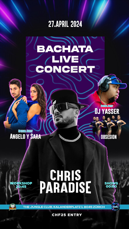 SAMSTAG, 27.04.2024 BACHATA LIVE CONCERT ***CHRIS PARADISE*** ***ANGELO Y SARA*** *** BACHATA | SALSA *** *** 2 DANCE FLOORS *** *** 1 WORKSHOP *** *** 2 SHOWS *** *** SPECIAL GUEST CHRIS PARADISE *** *** SPECIAL GUEST ANGELO Y SARA (ITALY) *** *** SPECIAL GUEST OBSESION (CH) *** *** DJ YASSER *** FULL PASS 25 CHF WORKSHOP PLAN 20:45-21:30 ANGELO Y SARA - BACHATA PARTY START 21:30Uhr SHOWS OBSESION ANGELO Y SARA Lass dich entführen und geniesse die atemberaubende Magie der neuen Event Location im Shopping Center SIHLCITY in Zürich! Es erwartet dich ein Spektakel mit bezaubernden Shows im ""THE JUNGLE CLUB"". === THE JUNGLE CLUB === Kalanderplatz 1 | 8045 Zürich Wiedikon | Sihlcity https://eventfrog.ch/de/p/party/latin-brasil/bachata-event-live-concert-chris-paradise-7167075504830280461.html