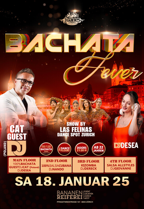🔥 BACHATA FEVER 🔥 DJ CAT & DJ DESEA Bananenreiferei by Juanes SAMSTAG 18. JANUAR 2025 🔥🔥🔥 ● 4 DANCE FLOORS ● AB 22 JAHREN ● DOORS: 21:30 – 04:00 UHR ● EINTRITT CHF 20.- ● EINTRITT: BEZAHLUNG AN DER KASSE NUR BARGELD ● GRATIS GARDEROBE ● 400 AUTO PARKPLÄTZE 🔥🔥🔥 ● 20:30 Uhr WORKSHOP BY .... 🔥 Sie brauchen nicht zu buchen, kommen Sie direkt zum Bananenreiferei am Samstag, …………. um 20:15 Uhr. Der Workshop Preis ist CHF 25.- Inkl. Garderobe & Party auf 4 Dance Floors. 🔥🔥🔥 ● SHOW 00:00 Uhr ● LAS FELINAS by Dance Spot Zürich 🔥🔥🔥 ● MAIN FLOOR: 100% BACHATA FEVER (371 m2 Dance Floor) ● GUEST DJ CAT aus Poland ● DJ DESEA Bachata Fusion, Sensual, Moderna, Clasica, Del Recuerdo 🔥🔥🔥 ● 2ND FLOOR: 100% SALSA CUBANA: DJ NANDO 100% Salsa Cubana, Timba, Rumba,Fiesta. 🔥🔥🔥 ● 3RD FLOOR: KIZOMBA FEVER: DJ DERECK Kizomba, Semba, Tarraxinha, Afrohouse, Urban Kiz 🔥🔥🔥 ● 4TH FLOOR: SALSA ALLSTYLES DJ GIOVANNI Salsa Allstyles, Clasica, Puertorriqueña, Romantica 🔥🔥🔥 BANANENREIFEREI Pfingstweidstrasse 101 8005 Zürich 🔥🔥🔥 SEARCH MAP https://search.ch/.../Bananenreiferei,Z%C3%BCrich... 🔥🔥🔥 DATES BACHATA FEVER 2025 BANANENREIFEREI ● Sa 18. Januar 2025 ● Sa 15. Februar 2025 ●Sa 15. März 2025 ● Sa 19. April 2025 ● Sa 17. Mai 2025 ● Sa 21. Juni 2025 ● Sa 12. Juli 2025 ● Sa 16. August 2025 ● Sa 18. Oktober 2025 ● Sa 15. November 2025 ● Sa 20. Dezember 2025 🔥🔥🔥 FOLLOW US in INSTAGRAM https://www.instagram.com/bachata_fever_juanes/ 🔥🔥 OFFICIAL JUANES EVENTS FACEBOOK https://www.facebook.com/juanesevents 🔥🔥 Bienvenidos Juanes Events https://juanesevents.ch/ http://juanesevents.ch/