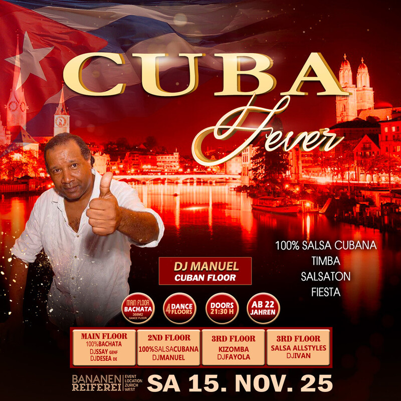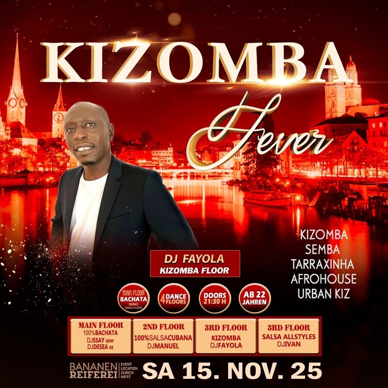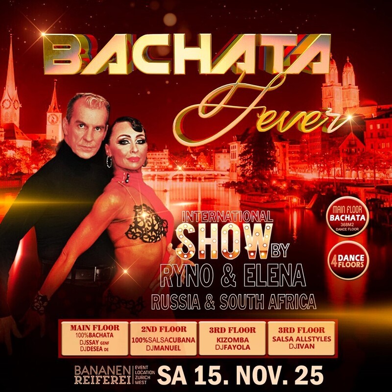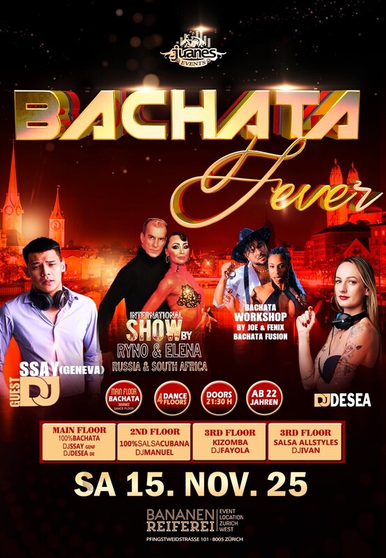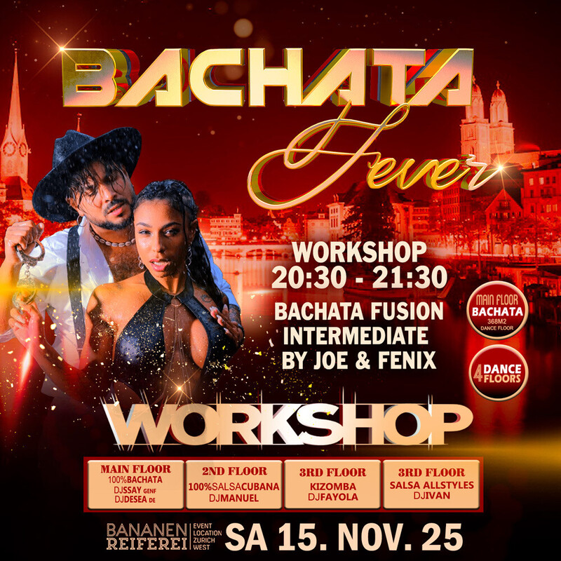 🔥 BACHATA FEVER 🔥 DJ DESEA DJ SSAY / WS by Joe & Fenix Bananenreiferei by Juanes 🔥🔥🔥 🔥 4 DANCE FLOORS 🔥 AB 22 JAHREN 🔥 DOORS: 21:30 – 04:00 UHR 🔥 EINTRITT CHF 20.- 🔥 EINTRITT: BEZAHLUNG AN DER KASSE NUR BARGELD 🔥 GRATIS GARDEROBE 🔥 400 AUTO PARKPLÄTZE 🔥🔥🔥 20:30 Uhr WORKSHOP BY JOE & FENIX . BACHATA FUSION . INTERMEDIATE 🔥 Sie brauchen nicht zu buchen, kommen Sie direkt zum Bananenreiferei am Samstag 15 November 2025 um 20:15 Uhr. Der Workshop Preis ist CHF 25.- Inkl. Garderobe & Party auf 4 Dance Floors. 🔥🔥🔥 SHOW 00:00 Uhr by RYNO & ELENA aus South Africa and Russia The mambo Dance to Bachata 🔥🔥🔥 🔥 MAIN FLOOR: 100% BACHATA FEVER (371 m2 Dance Floor) 🔥 DJ DESEA (De) 🔥 DJ SSAY (Geneva) Bachata Fusion, Sensual, Moderna, Clasica, Del Recuerdo 🔥🔥🔥 🔥 2ND FLOOR: 100% SALSA CUBANA: DJ MANUEL 100% Salsa Cubana, Timba, Rumba,Fiesta. 🔥🔥🔥 🔥 3RD FLOOR: KIZOMBA FEVER: DJ FAYOLA Kizomba, Semba, Tarraxinha, Afrohouse, Urban Kiz 🔥🔥🔥 🔥 4TH FLOOR: SALSA ALLSTYLES DJ IVAN Salsa Allstyles, Clasica, Puertorriqueña, Romantica 🔥🔥🔥 BANANENREIFEREI Pfingstweidstrasse 101 8005 Zürich 🔥🔥🔥 SEARCH MAP https://search.ch/.../Bananenreiferei,Z%C3%BCrich... 🔥🔥🔥 DATES BACHATA FEVER 2025 BANANENREIFEREI Sa 15. November 2025 Sa 20. Dezember 2025 🔥🔥🔥 FOLLOW US in INSTAGRAM https://www.instagram.com/bachata_fever_juanes/ 🔥🔥 Bienvenidos Juanes Events https://juanesevents.ch/2-0-Events.html
