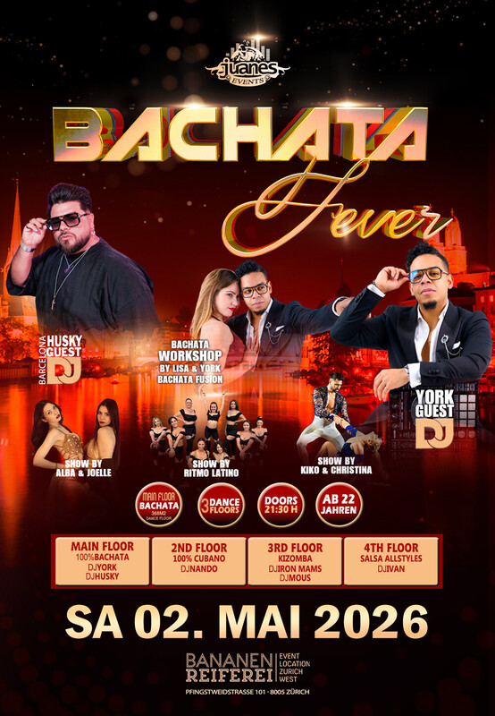 🔥 BACHATA FEVER 🔥DJ York & DJ Husky Workshop by Yorks & Lisa, Shows, Bananenreiferei SAMSTAG 02. MAI 2026 ●●●● 🔥 4 DANCE FLOORS 🔥 AB 22 JAHREN 🔥 DOORS: 21:30 – 04:00 UHR 🔥 EINTRITT CHF 20.- 🔥 EINTRITT: BEZAHLUNG AN DER KASSE NUR BARGELD 🔥 GRATIS GARDEROBE 🔥 400 AUTO PARKPLÄTZE ●●●● ● 20:30 Uhr WORKSHOP by YORK & LISA ● STYLE: BACHATA FUSION ● LABEL: INTERMEDIATE 🔥 Sie brauchen nicht zu buchen, kommen Sie direkt zum Bananenreiferei am Samstag 02. Mai 2026 um 20:15 Uhr. Der Workshop Preis ist CHF 25.- Inkl. Garderobe & Party auf 4 Dance Floors. ●●●● BACHATA SHOW 00:00 Uhr by . RITMO LATINO . Bachata Ladystyle Team Tentacion ●●●● . ALBA & JOELLE . Bachata Aus Barcelona Move ●●●● . KIKO & CHRISTINA . Show: San Juan ●●●● 🔥 MAIN FLOOR: 100% BACHATA FEVER (371 m2 Dance Floor) 🔥 DJ YORK 🔥 DJ LISA Bachata Fusion, Sensual, Moderna, Clasica, Del Recuerdo ●●●● 🔥 2ND FLOOR: 100% SALSA CUBANA: DJ NANDO 100% Salsa Cubana, Timba, Rumba,Fiesta. ●●●● 🔥 3RD FLOOR: KIZOMBA FEVER: DJ IRON MAMS DJ MOUS Kizomba, Semba, Tarraxinha, Afrohouse, Urban Kiz ●●●● 🔥 4TH FLOOR: SALSA ALLSTYLES DJ GIOVANNI Salsa Allstyles, Clasica, Puertorriqueña, Romantica ●●●● BANANENREIFEREI Pfingstweidstrasse 101 8005 Zürich 🔥🔥🔥 DATES BACHATA FEVER 2026 BANANENREIFEREI Sa 02. Mai 2026 Sa 16. Mai 2026 Sa 20. Juni 2026 sa 18. Juli 2026 Sa 15. August 2026 Sa 17. Oktober 2026 Sa 21. November 2026 🔥🔥🔥 Bienvenidos Juanes Events https://juanesevents.ch/