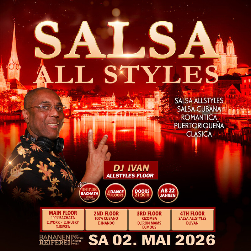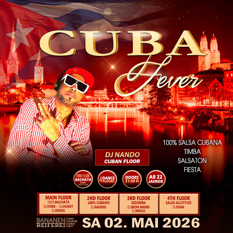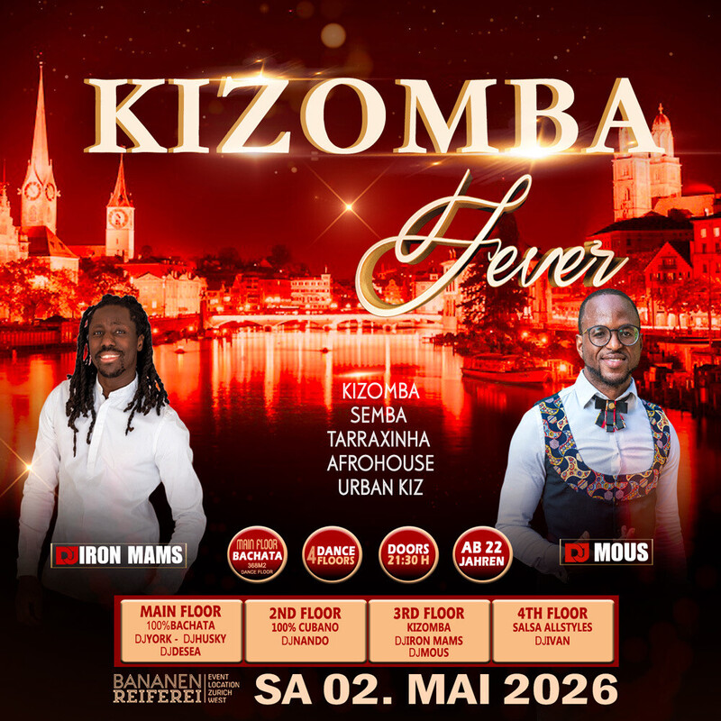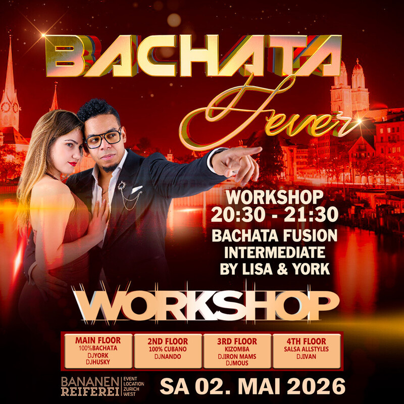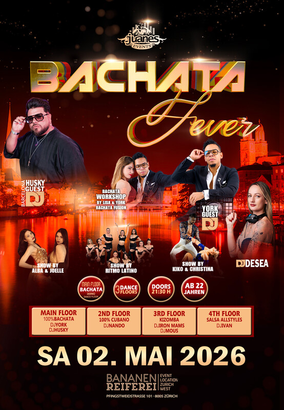 🔥 BACHATA FEVER 🔥DJ York & DJ Husky Workshop by Yorks & Lisa, Shows, Bananenreiferei SAMSTAG 02. MAI 2026 ●●●● 🔥 4 DANCE FLOORS 🔥 AB 22 JAHREN 🔥 DOORS: 21:30 – 04:00 UHR 🔥 EINTRITT CHF 20.- 🔥 EINTRITT: BEZAHLUNG AN DER KASSE NUR BARGELD 🔥 GRATIS GARDEROBE 🔥 400 AUTO PARKPLÄTZE ●●●● ● 20:30 Uhr WORKSHOP by YORK & LISA ● STYLE: BACHATA FUSION ● LABEL: INTERMEDIATE 🔥 Sie brauchen nicht zu buchen, kommen Sie direkt zum Bananenreiferei am Samstag 02. Mai 2026 um 20:15 Uhr. Der Workshop Preis ist CHF 25.- Inkl. Garderobe & Party auf 4 Dance Floors. ●●●● BACHATA SHOW 00:00 Uhr by . RITMO LATINO . Bachata Ladystyle Team Tentacion ●●●● . ALBA & JOELLE . Bachata Aus Barcelona Move ●●●● . KIKO & CHRISTINA . Show: San Juan ●●●● 🔥 MAIN FLOOR: 100% BACHATA FEVER (371 m2 Dance Floor) 🔥 DJ YORK 🔥 DJ HUSKY 🔥 DJ DESEA Bachata Fusion, Sensual, Moderna, Clasica, Del Recuerdo ●●●● 🔥 2ND FLOOR: 100% SALSA CUBANA: DJ NANDO 100% Salsa Cubana, Timba, Rumba,Fiesta. ●●●● 🔥 3RD FLOOR: KIZOMBA FEVER: DJ IRON MAMS DJ MOUS Kizomba, Semba, Tarraxinha, Afrohouse, Urban Kiz ●●●● 🔥 4TH FLOOR: SALSA ALLSTYLES DJ GIOVANNI Salsa Allstyles, Clasica, Puertorriqueña, Romantica ●●●● BANANENREIFEREI Pfingstweidstrasse 101 8005 Zürich 🔥🔥🔥 DATES BACHATA FEVER 2026 BANANENREIFEREI Sa 02. Mai 2026 Sa 16. Mai 2026 Sa 20. Juni 2026 sa 18. Juli 2026 Sa 15. August 2026 Sa 17. Oktober 2026 Sa 21. November 2026 🔥🔥🔥 Bienvenidos Juanes Events https://juanesevents.ch/