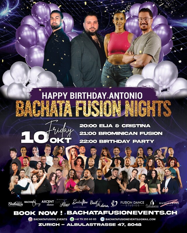 Ready for the next? This time with the Birthday-Edition for one of our organizers Antonio!🎉 Increase your dance level in a workshop with Elia & Cristina and challenge yourself in the Brominican Fusion workshop with Flavio & Antonio ✨ Save the Date: 🗓️ Friday, 10. October 2025 📍Location: Albulastrasse 47, Zürich Schedule: 🕗 20:00 – Workshop #1 Elia & Cristina 🕘 21:00 – Workshop #2 Brominican Fusion 🎉 22:00 – PARTY all night long https://bachatafusionevents.ch