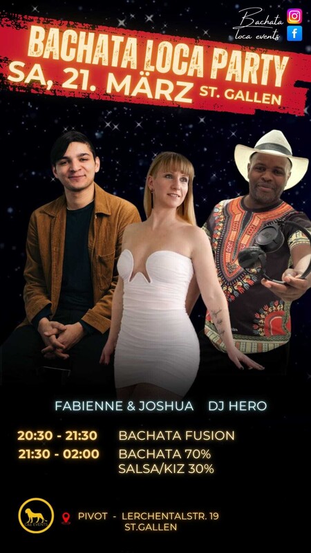 Next Bachata loca in March. Already 21st of march. Details • 📅: Samstag 21 März • 📍: Pivot, Lerchentalstr. 19, St. Gallen • 🕘 20:30 - 21:30: Bachata fusion Pre-Party Workshop mit Fabienne & Joshua • 🎧 Ab 21:30 Uhr: Party mit DJ Hero • 🎧 Party mit BACHATA 70%, Salsa/Kizomba 30% • 🧾 https://www.eventfrog.ch/bachataloca_marz 🎟️ Workshop & Party • 💸 Im Vorverkauf: 20 CHF • 💵 Abendkasse: 25 CHF • ✅ Pre-Party Workshop • ✅ Party-Eintritt 🕺 Nur Party-Ticket • 🎉 Im Vorverkauf: 10 CHF • 🎉 Abendkasse: 15 CHF • ✅ Party-Eintritt Genügend Parkplätze vor dem Haus und an der Lerchentalstrasse 21 gibt auch Gästeparkplätze. Zusätzlich auf dem Kiesplatz «Stoffwechselzentrum und Altrimo» gibt auch mehr Gästeparkplätze!! Exklusive Bachata Workshop & Top-DJs! Nehmt an unserem Bachata-Workshop für jede niveau. Diese Workshops werden manchmal in English aber meistens in Deutsch gegeben. Wir garantieren wir eine Nacht voller neuster und grossartiger Bachata Hits! Wir freuen uns auf euch! 💃🕺 Euer Bachata Loca Team & C & E Events GmbH / Pivot Team www.ce-events.ch