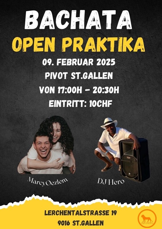 Bachata Open Praktika in St. Gallen! Am 09. Februar 2025 findet das zweite Open Praktika statt, bei dem unsere Schüler mit externen Tanzbegeisterten üben können. Das Pivot St. Gallen verwandelt sich an diesem Tag in einen Ort voller Rhythmus und Spass. Egal ob Anfänger oder erfahrener Tänzer – dieses Event bietet dir die Möglichkeit, neue Moves/Figuren zu praktizieren, bestehende Techniken zu verfeinern und Gleichgesinnte kennenzulernen. Highlights: Marc & Özlem: Unser Tanzpaar steht euch bei Fragen zur Verfügung. DJ Hero: Mit den besten Bachata-Beats sorgt er für die perfekte Tanzstimmung. Uhrzeit: Von 17:00 Uhr bis 20:30 Uhr. Eintritt: Nur 10 CHF – ein unschlagbares Preis-Leistungs-Verhältnis!(Preis gilt nicht für die Schüler von Pivot) Location: Pivot St. Gallen, Lerchentalstrasse 19, 9016 St. Gallen. Warum teilnehmen? Tanz mit unseren Schülern. Knüpfe Kontakte mit anderen Tanzbegeisterten. Geniesse ein Day social und komm nicht zu spät nachhause. Jetzt teilnehmen! Markiere dir das Datum und lade deine Freunde ein – zusammen macht Tanzen noch mehr Spass. Wir freuen uns auf dich! #BachataStGallen #BachataEvent #TanzenInStGallen #BachataSchweiz #DJHero #MarcyUndÖzlem #PivotStGallen #tanzenstgallen https://ce-events.ch