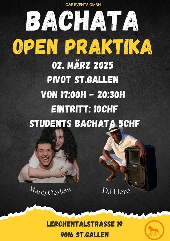 Bachata Open Praktika in St. Gallen! Am 02. März 2025 findet das dritte Open Praktika statt, bei dem unsere Schüler mit externen Tanzbegeisterten üben können. Das Pivot St. Gallen verwandelt sich an diesem Tag in einen Ort voller Rhythmus und Spass. Egal ob Anfänger oder erfahrener Tänzer – dieses Event bietet dir die Möglichkeit, neue Moves/Figuren zu praktizieren, bestehende Techniken zu verfeinern und Gleichgesinnte kennenzulernen. Highlights: Marc & Özlem: Unser Tanzpaar steht euch bei Fragen zur Verfügung. DJ Hero: Mit den besten Bachata-Beats sorgt er für die perfekte Tanzstimmung. Workshop mit Marc & Özlem von 17 bis 18 Uhr!! Uhrzeit: Von 17:00 Uhr bis 20:30 Uhr. Eintritt: Nur 10 CHF – ein unschlagbares Preis-Leistungs-Verhältnis! (Students Bachata von Marc & Özlem für 5.- Fr.) Location: Pivot St. Gallen, Lerchentalstrasse 19, 9016 St. Gallen. Warum teilnehmen? Tanz mit unseren Schülern. Knüpfe Kontakte mit anderen Tanzbegeisterten. Geniesse ein Daysocial und komm nicht zu späte nachhause. Jetzt teilnehmen! Markiere dir das Datum und lade deine Freunde ein – zusammen macht Tanzen noch mehr Spass. Wir freuen uns auf dich! #BachataStGallen #BachataEvent #TanzenInStGallen #BachataSchweiz #DJHero #MarcyUndÖzlem #PivotStGallen #tanzenstgallen Wir freuen uns auf schöne Tanzstunden mit euch!!! https://ce-events.ch