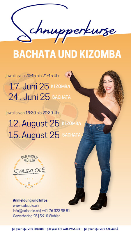 𝐁𝐀𝐂𝐇𝐀𝐓𝐀 𝐮𝐧𝐝 𝐊𝐈𝐙𝐎𝐌𝐁𝐀 𝐏𝐫𝐨𝐛𝐞𝐥𝐞𝐤𝐭𝐢𝐨𝐧𝐞𝐧 Komm vorbei, nimm deine Freunde, Family, Nachbarn & Co. mit und probier es einfach aus - kostenlos und unverbindlich! Hat es dir gefallen, können wir gleich anschliessend mit dir unser aktuelles Kursprogramm anschauen, wir finden bestimmt eine passende Einstiegsmöglichkeit! Diese Probelektionen finden IMMER statt! Wir freuen uns auf dich! https://salsaole.ch/