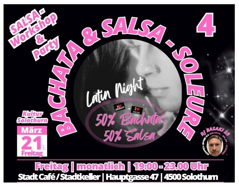 Liebe Tanzbegeisterte,😜🕺💃 (❤️ WE LOVE BACHATA & SALSA - SOLEURE 😉) Herzlich Willkommen zu «BACHATA & SALSA - SOLEURE», deinem Treffpunkt für die monatliche Bachata & Salsa - Party, im reizenden Stadtkeller Solothurn, in der atemberaubenden City von Solothurn. Im charmanten Ambiente des Stadt Cafés / Stadtkeller in Solothurn laden wir euch zu einem unvergesslichen Abend voller Romantik, Leidenschaft und Rhythmus ein 💃🕺😜! Lasst uns an diesem besonderen Abend die Magie des Tanzes erleben und die Herzen im Takt schlagen. Tanze zu den verführerischen Klängen der Bachata und den lebendigen Rhythmen der Salsa. Ob als Paar oder solo, dieser Abend verspricht, eure Herzen höher schlagen zu lassen und euch unvergessliche Momente zu schenken. Highlights des Abends: 19:00 - 20:00 Salsa Workshop mit Stephan (Beginner Level) 20:00 - 23:00 Party mit DJ ROWA 62 (50% Bachata & 50% Salsa) Das schöne Stadt Café, welches von Schuan Tahir geführt wird, liegt gleich oberhalb des Stadtkellers im Parterre. Während der Party sind im Stadt Café bis 23:00 Uhr Getränke erhältlich. Triff dort vor dem Event neue Leute, tausche Geschichten aus und bereite dich vor in den leidenschaftlichen und sinnlichen Tanz von Bachata & Salsa einzutauchen. Erlebe einen romantischen Bachata & Salsa Abend im Stadt Café / Stadtkeller Solothurn 😜💃🕺! Unser Hauptmotto: !!! Nicht gross nachdenken «EINFACH SPASS» haben😊!!! Wir freuen uns darauf, diesen magischen Abend mit euch zu teilen! ----------------------------------------------------------------------------------------------------------------- Mit deiner Teilnahme an «BACHATA & SALSA - SOLEURE» willigst du ein, dass wir für Impressionen & Werbemittel, evtl. Bilder&Videos von dir nutzen dürfen - Vielen Dank! ------------------------------------------------------------------------------------------------------------------ BACHATA & SALSA - SOLEURE ist ein FORMAT der «EINFACH SPASS EVENTs» !!! Viel Spass😜🕺 https://einfachspass.ch/