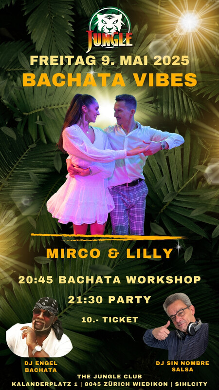 BACHATA VIBES * PARTY * * BACHATA WORKSHOP * * BACHATA FLOOR * * SALSA FLOOR * * DJ ENGEL - BACHATA * * DJ SIN NOMBRE - SALSA * Timetable 20:45 Bachata Workshop 21:30 Party 10 CHF Eintritt www.thejungleclub.ch