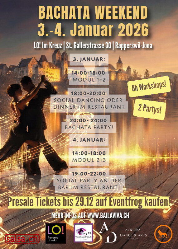 🎵 Programm 🎵: Samstag, 3. Januar 14:00-18:00 Bachata Modul 1+2 (Raum Atrium, Kreuz) 18:00-20:00 Social Dancing oder Dinner im Restaurant nach Wunsch 20:00-24:00 100% Bachata Party mit DJ Giovanni! (Raum Atrium, Kreuz) Sonntag, 4. Januar 14:00-18:00 Bachata Modul 2+3 (Raum Atrium, Kreuz) 18:00-22:00 Social Dancing oder Dinner im Restaurant nach Wunsch 19:00-22:00 Social Party an der Bar im Restaurant LO! Salsa + Bachata! 🎵 Bachata Intensiv Weekend – Beginner Der schnellste und klarste Weg, Bachata wirklich zu verstehen. Ein Wochenende, das deinen Tanzstart transformiert: Kein Schrittchaos. Keine Unsicherheit. Keine Überforderung. Bei Bailaviva lernst du Bachata mit einem System, das sofort wirkt – körperlich, technisch und im Paar. 👉 Perfekt für absolute Beginner und motivierte Einsteiger 👉 Schnelle, sichtbare Fortschritte durch präzise Unterrichtsmethodik 👉 Klare Struktur, weiche Verbindung, stabile Technik ⭐ WARUM DIESER WORKSHOP ANDERS IST Wir bringen dir nicht nur Schritte bei – wir entwickeln Tänzer. Andere unterrichten Figuren. Wir bauen das Fundament, das jede Figur trägt. Unser Unterricht beginnt dort, wo Tanzen tatsächlich entsteht: im Körper, in der Biomechanik, in der Verbindung zweier Menschen. Du lernst Bachata von Anfang an richtig – weich, kontrolliert und stabil. 🔥 MODUL 1 – GROUNDING Das technische Fundament für flüssige Partnerverbindung „Bevor wir Schritte lernen, schaffen wir das System, das jeden Schritt trägt.“ Grounding ist ein präzises Trainingsmodul, das dir in wenigen Minuten spürbar mehr Kontrolle gibt. Grounding ist kein Warm-up. Es ist der Beschleuniger deines gesamten Tanzfortschritts. 🔥 MODUL 2 – FOUNDATION FLOW (Level 1) Basics, Rhythmusgefühl & erste Figuren – technisch sauber aufgebaut. Foundation Flow ist mehr als ein Anfänger-Level: Es ist der Moment, in dem du verstehst, wie Tanzen funktioniert. Ergebnis: Du fühlst dich sicher, orientiert und kannst dich im Social Dance bewegen – ohne Stress und ohne Überforderung. 🔥 MODUL 3 – CONNECTION FLOW (Level 2) Verbindung. Dynamik. Erste echte Figuren. Hier beginnt Tanzen, seine Form zu zeigen. Ergebnis: „Jetzt tanze ich wirklich – und ich weiß, warum es funktioniert.“ 💎 DEIN MEHRWERT BEI BAILAVIVA Intensives Lernen ohne Druck Didaktik statt Schrittfolgen Klarer Fortschritt von Stunde zu Stunde Sofort sichtbare Veränderungen in Technik & Gefühl Ein System, das nachhaltiges Lernen ermöglicht Social Dance–tauglich innerhalb eines Wochenendes Dieses Wochenende schafft Sicherheit, Orientierung und echte Tanzfreude. 🚀 FÜR WEN IST DAS WEEKEND PERFEKT? ✔ Absolute Anfänger, die einen starken, klaren Start wollen ✔ Wiedereinsteiger, die verstehen wollen, warum Tanzen funktioniert ✔ Tanzende, die Connection & Technik verbessern möchten ✔ Paare & Einzelpersonen – beide sind willkommen 🎯 DAS BEKOMMST DU AN EINEM WOCHENENDE über 8 Stunden hochwertiger Unterricht klare Struktur & perfekt aufeinander abgestimmte Module intensives Training ohne Überforderung Technik, die sofort funktioniert erste Figuren mit Flow, Eleganz & Sicherheit ein Tanzgefühl, das bleibt 100% Bachata Party am Abend! https://eventfrog.ch/bachataweekend