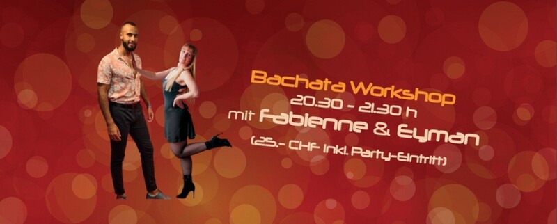 Bachata Workshop mit Fabienne & Eyman inkl. Party-Ticket für Fiesta Bachata Lerne neue Bachata Figuren mit Fabienne & Eyman und tanze diese gleich anschliessend an der Fiesta Bachata ab 21:30 Uhr mit drei Floors u.a. Bachata-Floor mit DJ Ñoño! Workshop inkl. Party-Eintritt für 25.- CHF Abendkasse oder Vorverkauf via Eventfrog: https://eventfrog.ch/de/p/kurse-seminare/musik-tanz/bachata-workshop-mit-fabienne-eymann-7262599780290787447.html https://eventfrog.ch/de/p/kurse-seminare/musik-tanz/bachata-workshop-mit-fabienne-eymann-7262599780290787447.html