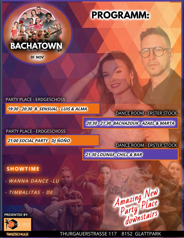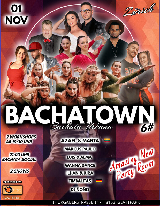 WIR SIND FROH UNSERE WUNDERSCHÖNE NEUEN PARTY LOKAL UND EVENT STRUKTUR ZU PRÄSENTIEREN! Bei diesem Event, welches, immer am ersten Freitag jedes zweite Monat stattfindet, wird zu 100% Bachata gespielt. Bei jeder Bachatown Edition erwarten euch andere Artists und DJs. Besonders die nationalen und internationalen Artisten und DJs machen diese Eventreihe zu einem einzigartigen Erlebnis. Die DSZ Tanzschule ist darauf bedacht, aktuelle, relevante und vor allem qualitative Lineups für euch vorzubereiten. SPECIAL GUESTS: • Azael & Marta • Marcus Paulo • Luis & Alma • Ilhan & Kira • Daniel Abisrror • Las Felinas • Aurelia & Vanessa • Timbalitas PROGRAMM: • "Türöffnung 19:00 WORKSHOPS - 1. Stock - Raum 188 19:30 - 20:30 - BACHATA SENSUAL by Luis & Alma 🇨🇭 20:30 - 21:30 - BACHAZOUK by Azael & Marta 🇲🇽🇵🇱 ____________________________________ 21:00 - SOCIAL PARTY TIME - ERDGESCHOSS Musik 100% Bachata All Style mit DJ Ñoño 🇨🇭 ____________________________________ SHOWTIME: • Wanna Dance (🇨🇭 LU) • Timbalitas (🇩🇪 DE) ___________________________________ 📌 LOKAL: Dance Spot Zurich Thurgauerstrasse 117, 8152 Zürich TMC Fashion Gebäude ____________________________________ https://www.facebook.com/share/ET67fS3cEX2J3ndw/