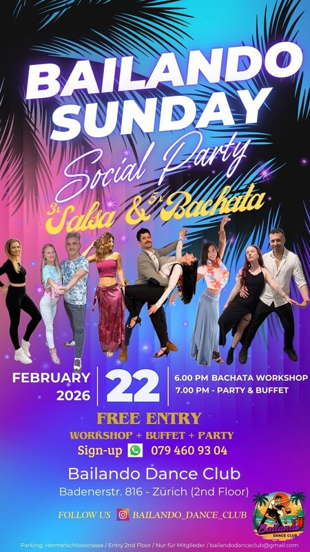 Bailando Sunday – Social Party! Liebe Bailanderos Am Sonntag, 22. Februar 2026 laden wir euch herzlich zu unserem nächsten Bailando Sunday im Bailando Dance Club ein! ✨ 18.00 Uhr – Bachata Workshop ✨ 19.00 Uhr – Party & Buffet 🎶 Dj-Set 3x Salsa & 5x Bachata 🍽️ Workshop + Buffet + Party 🎉 Free Entry Lasst uns gemeinsam das Parkett zum Glühen bringen, neue Figuren ausprobieren, lachen, geniessen und einfach einen wunderschönen Tanzabend verbringen. 📍 Bailando Dance Club Badenerstr. 816, Zürich (2. Stockwerk) 👉 Anmeldung : 079 460 93 04 oder 076 468 40 01 (Whatsapp) Wir freuen uns auf euch! ❤️ Euer Bailando Team https://www.instagram.com/bailando_dance_club/