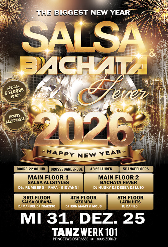 ✯ SALSA NEW YEAR’S EVE 2025 -26 TANZWERK 101 ✯ ✯ MITTWOCH 31. DEZEMBER 2025 ✯ 5 Dance Floors ✯ Tanzwerk 101 ist neben Bananenreiferei ✯✯✯ Juanes Party heisst Euch herzlich willkommen zur grössten Silvester Party 2025-6. Zusammen feiern wir den Abschied vom alten Jahr und begrüssen das neue Jahr. Juanes Party offeriert eine unvergessliche Party-Nacht bis zum Sonnenaufgang, auf 5 Tanzflächen für jeden Geschmack etwas dabei. Ohne Zweifel garantieren wir, dass der 31. Dez. 2025 ein Treffpunkt für alle sein wird um das 2025 in Empfang nehmen zu dürfen. ✯✯✯ ✯ AB 22 JAHREN ✯ 4 DANCE FLOORS ✯ DOORS: 22:00 – 05:00 UHR ✯ 10 TOP SALSA, BACHATA, CUBA, KIZOMBA, ZOUK DJS ✯ GARDEROBE GRATIS ✯ EINTRITT: BEZAHLUNG AN DER KASSE NUR BARGELD ✯ GETRÄNKE-BAR: BARGELD & CREDITCARD ✯ 300 AUTO-PARKPLÄTZE ✯✯✯ ✯✯✯ UM 23.59 UHR BEGINNEN WIR MIT DEM COUNTDOWN ✯✯✯ MAIN FLOOR: SALSA ALLSTYLES>> Tanzwerk 101 >> 368 m² Dance Floor DJ RUMBERO (DE) DJ RAFA (BS) DJ GIOVANNI (ZH) Salsa Allstyles - Cubano - Clasica – Puertorriqueña - Salsa Pal Bailador ✯✯✯ MAIN FLOOR: BACHATA FEVER>> TANZWERK 101 >> 250 m² Dance Floor DJ HUSKY (Barcelona) DJ DESEA (De) DJ LUJO 100% Bachata Fusion, Sensual, Moderna, Clasica, del Recuerdo ► Der Bachata Floor ist so gross wie der Main Floor, so dass die Bachata Fever Bachateros viel Platz haben, um das neue Jahr zu begrüssen. ✯✯✯ 3RD FLOOR CUBANO>> DJ MANUEL DJ INMENSO 100% Salsa Cubana / Timba / Salsaton / Fiesta ✯✯✯ 4th FLOOR: KIZOMBA>> DJ IRON MAMS DJ MOUS Kizomba Semba Tarraxinha Urban Kiz ✯✯✯ 5TH FLOOR: TROPICAL HITS DJ DANILO ✯✯✯ ✯ Eintritt CHF 30.- Inkl. 5 Dance Floors & Garderobe Gratis ✯ Du kannst Dein SPECIAL TICKET in Deiner Tanzschule oder bei Salsa, Bachata, Kizomba, Zouk, DJs & Partners bestellen, es in Deinem Handy aufbewahren und dann an der Kasse vorzeigen und Du erhältst einen Rabatt von CHF 5.- ✯✯✯ AUF DEM DACH DES TANZWERK 101 HABEN WIR PARKPLÄTZE FÜR 300 AUTOS ✯✯✯ LOCATION: TANZWERK 101, neben Bananenreiferei Pfingstweidstrasse 101 8005 Zürich ✯✯✯ Bienvenidos Juanes Events https://juanesevents.ch/2-0-Events.html