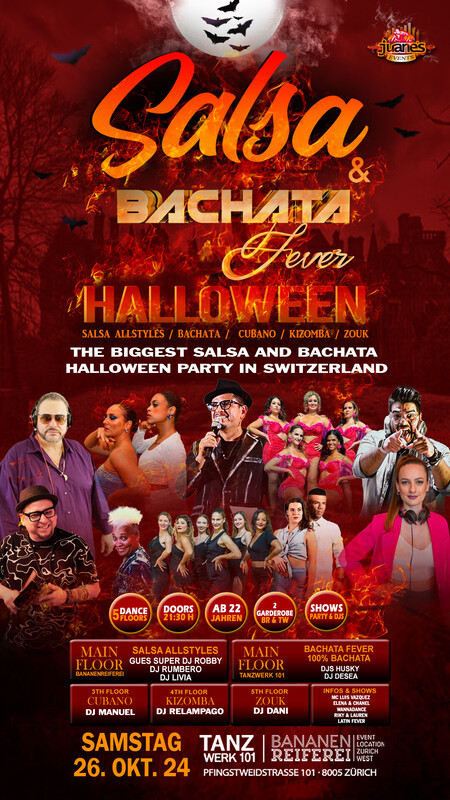 THE BIGGEST SALSA AND BACHATA ☠HALLOWEEN☠ PARTY IN SWITZERLAND Samstag 26. OKTOBER 2024 Bananenreiferei & Tanzwer 101 Zürich ☠☠☠ ● AB 22 JAHREN ● 2 GROSSE CLUBS ● 5 DANCE FLOORS ● DOORS: 21:30 – 04:30 UHR ● 7 TOP SALSA, BACHATA, CUBA, KIZOMBA, ZOUK DJS ● TOP NATIONAL & INTERNATIONAL SHOWS ● GARDEROBE GRATIS ● EINTRITT: BEZAHLUNG AN DER KASSE NUR BARGELD. ● GETRÄNKE-BAR: BARGELD & CREDITCARD. ● 2 GROSSE GARDEROBE ● 400 AUTO PARKPLÄTZE ☠☠☠ Herzlich willkommen zur GRÖSSTEN SALSA & BACHATA Halloween Party der Schweiz. Einmal mehr heissen wir HALLOWEEN 2024 willkommen, ein spezielles Datum und die meist erwartete Party, sie bringt uns viele Überraschungen mit vielen Kreationen der erkleidungen und Schminke. Eine spektakuläre Nacht der Hexen, Sie kommen in Ihrer besten Kreation, gruseliger Schminke und Kostüm. Ohne Zweifel, SALSA HALLOWEEN wird eine unvergessliche Party, Horror und wo alle viel Spass haben werden. Herzlichen Dank an unser tolles Publikum, dass Ihr uns immer die Energie gibt, Freundschaft, Vertrauen und Liebe. ☠☠☠ ● SHOWS 00:00 Uhr IN BANANENREIFEREI ● MC: LUIZ VAZQUEZ ● GUEST SHOW: by ● SHOW: by CHANEL & ELENA (Premier) ● SHOW: by LADIES WANNADANCE (Premier) ● SHOW: by RIKY CRUZ & LAUREN FISHER ☠☠☠ MAIN FLOOR: SALSA ALLSTYLES>> BANANENREIFEREI >> 368 m² Dance Floor SUPER DJ ROBBY (LA-USA) DJ RUMEBRO (DE) DJ LIVIA (ZH) Salsa Allstyles - Clasica – Puertorriqueña - Salsa Pal Bailador. ☠☠☠ MAIN FLOOR: BACHATA FEVER>> TANZWER 101 >> 371 m² Dance Floor DJ HUSKY DJ DESEA 100% Bachata Fusion, Sensual, Moderna, Clasica, del Recuerdo ☠☠☠ 3RD FLOOR CUBANO>> (Bananenreiferei) DJ MANUEL 100% Salsa Cubana / Timba / Cubaton / Fiesta ☠☠☠ 4th FLOOR: KIZOMBA>> (Bananenreiferei) DJ RELAMPAGO Kizomba Semba Tarraxinha Urban Kiz ☠☠☠ 5th FLOOR: ZOUK>> (Bananenreiferei) DJ DANI Zouk ☠☠☠ AUF DEM DACH DER BANANENREIFEREI & TANZWERK 101 HABEN WIR PARKPLÄTZE FÜR 400 AUTOS. ☠☠☠ Eintritt CHF 25.- Inkl. 5 Dance Floors & 2 Garderobe Gratis ☠☠☠ LOCATION: BANANENREIFEREI & TANZWERK 101 Pfingstweidstrasse 101 8005 Zürich ☠☠☠ Beinvenidos Juanes Events https://juanesevents.ch/ http://juanesevents.ch/