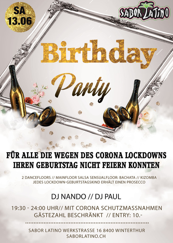 Eine Party für Alle Geburtstagskinder, die während des Corana Lockdowns ihren Geburtstag nicht feiern konnten. Das holen wir jetzt nach. Natürlich dürfen auch alle andere mit den Geburtstagskindern feiern. Jedes Geburtstagskind erhält einen Prosecco. Salsa // Bachata // Kizomba auf 2 Dancefloors Mainfloor: Salsa DJ Nando Sensualfloor: DJ Paul Entry: 10.- Der Anlass ist beschränkt auf 150 Personen Folgende Schutzmassnahmen müssen für die Party erfüllt werden: - Liste mit den Kontaktdaten der Gäste führen - Partyende um 24:00 Uhr - nicht mit zu vielen Partnern an einem Abend tanzen - in jedem Raum stehen Desinfektionsstationen zur regelmässigen Desinfektion der Hände - WC und Oberflächen werden regelmässig gereinigt - Die Räume sind gut belüftet - Wir nehmen Rücksicht auf die anderen Gäste und deren Wünsche saborlatino.ch