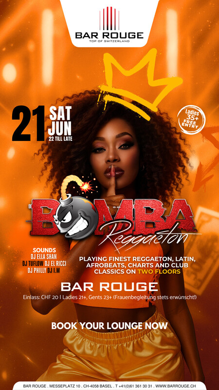 Am Samstag, den 21. Juni 2025 startet Bomba Reggaeton in die nächste Runde auf 105 Meter in der Bar Rouge. Beim Take Off mit an Bord sind DJs Ella Shan, TuFlow, El Ricci, Philly & I.M. Das Ganze gehostet von zwei der erfahrensten Veranstaltern von Basel; Bar Rouge & Bomba Reggaeton. Music: _30 Reggaeton & Latin _31 Club Classics, RnB, Charts https://www.barrouge.ch/de/events/Bomba-Reggaeton21062025/