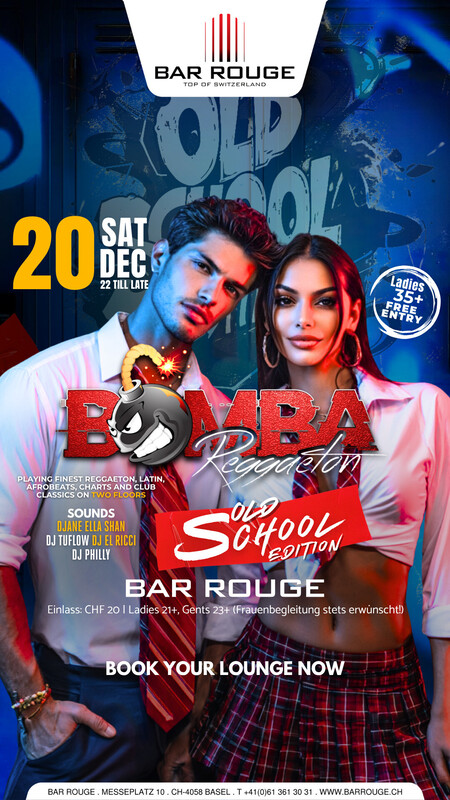 Am Samstag, den 20. Dezember 2025 startet Bomba Reggaeton in die nächste Runde auf 105 Meter in der Bar Rouge. Beim Take Off mit an Bord sind DJane Ella Shan sowie DJs El Ricci, Tuflow und Philly. Das Ganze gehostet von zwei der erfahrensten Veranstaltern von Basel; Bar Rouge & Bomba Reggaeton. https://www.barrouge.ch/de/events/Bomba-Reggaeton20122025/