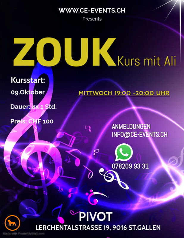 Wir starten unseren Brasilien Zouk Kurs mit Ali ab Mittwoch den 9.Oktober Dauer: 4 Wochen Fortlaufend nach dem 1.Kurs Zeit : 19 - 20 Uhr Ort: Pivot , St. Gallen Kosten 4x1 Std. CHF 100.-- (Pro Lektion CHF 25.-) Anmeldung: unter 078 209 93 31 oder per mail: info@ce-events.ch Oder: 076 250 02 18 zoukesprit@gmail.com Zielgruppe: Anfänger ohne oder mit Vorkenntnisse. Einzel oder paar Anmeldungen möglich, bitte genug früh anmelden, damit wir die Balance, Leader, Follower in einem akzeptablen rahmen halten können. Der Kurs findet ab 4 Teilnehmern statt. Zouk Hug 🫂 Wir freuen uns auf schöne Kursabende mit euch ! https://ce-events.ch