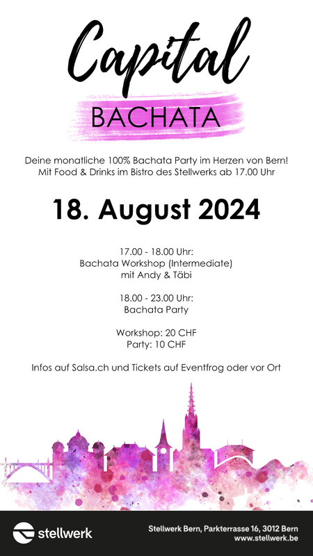 Wir sind zurück! Am 18. August startet unsere Capital Eventreihe in die nächste Runde! Komm vorbei und geniesse die gemütliche Stimmung am Sonntagabend bei uns am Capital Bachata. Schnapp dir deine Tanzschuhe und dein Lieblingsoutfit, lerne neue Moves am Workshop oder schwing das Tanzbein direkt auf die Tanzfläche. 17:00 - 18:00 Bachata Workshop (intermediate) mit Andy & Täbi Preis: 20 CHF 18:00 - 23:00 100% Bachata Party Preis: 10 CHF Location: Stellwerk Bern, Parkterasse 16, 3012 Bern Wegbeschreibung: Nimm den Lift im Bahnhof Bern in den 4. Stock, starte nach rechts und gehe dort einmal rechts um die Ecke. Food & Drinks Im Stellwerk kannst du leckeres Essen und erfrischende Getränke geniessen! Unser Favorit ist der Outlawz-Döner und der hausgemachte Eistee ;) Tickets Online auf Eventfrog oder an der Abendkasse (Bargeld) Folge Capital_Bachata&Kizomba auf Instagram, um immer über unsere neusten Events informiert zu sein! Wir freuen uns auf dich! Dein Capital Team https://eventfrog.ch/de/p/party/latin-brasil/capital-bachata-7222932691502461330.html