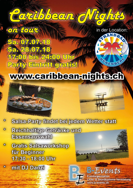 Caribbean Nights on tour in der Badi-Beiz Strandbad Hünenberg ► Party: Gratis Eintritt für ALLE ► Findet bei jedem Wetter statt ► mit gratis Salsaworkshop für Beginner ► Für die Musik: DJ Danzi ► Ort: Badi Beiz / Strandbad Hünenberg ► Organisator: B-Events ► Gastgeber: Reto & Badi-Beiz ► alles weitere unter http://www.caribbean-nights.ch ----------------------------------------------------------------------- ☆ ★ ☆ Weiterer Caribbean-Nights: ☆ ★ ☆ Sa. 07.07.2018 Badi Hünenberg ZG 17:00 Uhr Fr. 13.07.2018 Beachbar Nottwil Sa. 28.07.2018 Badi Hünenberg ZG Mi 22.08.2018 Badi Hünenberg ZG