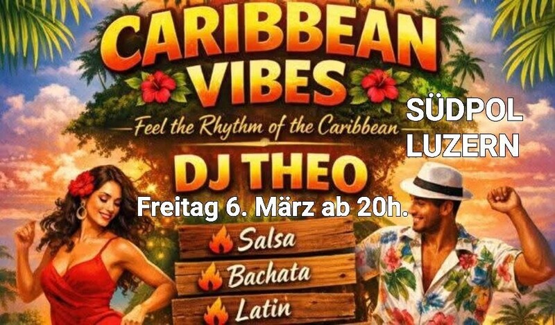 -- FREITAG 6. MÄRZ 2026 -- ★ CARIBBEAN VIBES ★ Feel the Rhythm of the Caribbean ★ Salsa & Bachata Tanzen im Südpol Luzern ------------------------------------------------ Tauche ein in eine Nacht voller heißer Beats, exotischer Rhythmen und karibischer Lebensfreude! Lass dich treiben von pulsierenden Sounds und purem Urlaubsfeeling mit der Legendär DJ Theo. ------------------------------------------------ Eintritt: AK: CHF 10 Beginn: 20:00 Uhr Einlass ab 18 Jahren. Ende ca. 02 Uhr. Das Zentrum für Kultur in der Zentralschweiz. Mehrspartenhaus mit Tanz, Theater, Musik und Club. ★ SÜDPOL Arsenalstrasse 28, 6010 Kriens, www.sudpol.ch ------------------------------------------------------- "ANREISE WICHTIGE INFORMATIONEN" ----------------------------------------------- Die Anfahrt mit Fahrrad oder ÖV wird empfohlen. Eine Wegbeschreibung findest Du via Google Maps. VELO: Vor und hinter dem Gebäude befinden sich ca. 200 Fahrradparkplätze. Vom Stadtzentrum Luzern ist der Südpol in etwa zehn Minuten via Freigleis zu erreichen. ÖV: Der Bus Nr. 14 fährt ab Bahnhof Luzern Richtung Horw Zentrum und hält direkt vor dem Haus. Die Haltestelle heisst Südpol. AUTO: Es steht nur eine beschränkte Anzahl Autoparkplätze für den Südpol zur Verfügung. Diese befinden sich unter dem neuen LSO-Gebäude und zwischen Metzger Center Zentralschweiz und dem neuen Backsteingebäude der Hochschule Musik Luzern. Die Parkplätze auf dem Vorplatz des Metzger Center Zentralschweiz stehen den Südpol-Besucher*innen nicht zur Verfügung. Als Ausweichmöglichkeit empfehlen wir das "Parkhaus Nidfeld". Facebook: https://fb.me/e/3oJiHk9QM