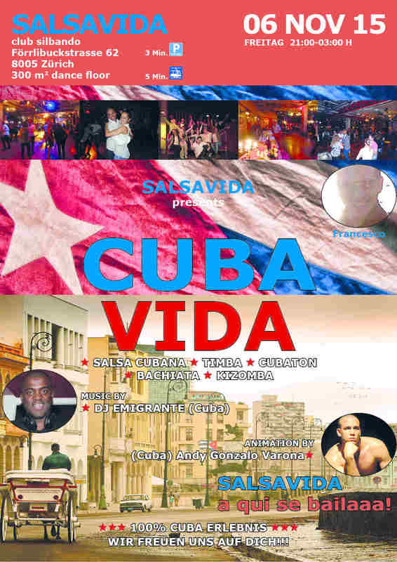 DORT WO DAS FEUER TANZT! SALSAVIDA presents https://www.facebook.com/events/935082916571514/ ★★★ CUBAVIDA PARTY★★★ ▶ 6 NOVEMBER / CLUB SILBANDO / ZÜRICH◀ ● MUSIC BY DJ Jorge (Cuba) ● ANIMATION BY Andy Gonzalo Varona (Cuba) ★★★Friday Night is SALSAVIDA Night★★★ Bienvenidos Salser@s, Salsavida präsentiert ein neues Partylabel im Herzen von Zürich mit vielen Artisten, Künstler und Animation aus der grössten und vielseitigsten karibischen Insel CUBA, der Schweiz und Europa. Auf der 300m2 grossen Pista im Club Silbando mit kubanischem Flair und multikulturellem Ambiente wird durch die besten DJ’s der Salsa und Latin Musik ordentlich performt und eingeheizt. Eine unvergessliche Tanznacht, Spass, Freude und Unterhaltung ist dabei garantiert! Wir freuen uns auf DICH! Saludos Francesco Salsavida WORKSHOP Salsa Fusion Mann/Frau Open Class Andy Gonzalo Varona Cuba Freitag 20:00 -21:00 H |06 NOV 15 | 20 NOV 15 | 04 DEZ 15| WS + Party CHF 35.- Only WS CHF 25.- Only Party CHF 15.- https://www.facebook.com/events/152137938474404/ CUBAVIDA Party: Freitag, 06. November ab 21:00h On the mix: DJ Jorge (Cuba) mit Salsa Cubana, Timba, Cubaton, Bachata, Kizomba Animation by: Andy Gonzalo Varona (Cuba) Eintritt Party CHF 15.‒ https://www.facebook.com/events/935082916571514/ Club Silbando, Förrlibuckstrasse 62, 8005 Zürich Parkmöglichkeiten: Parkhaus Toni Areal 3 Minuten Parkhaus Zürich-West an der Förrlibuckstrasse 151 4 Minuten Gehminuten: Escher-Wyss-Platz – Silbando, 6 Minuten / Technopark – Silbando, 6 Minuten / Bahnhof Hardbrücke – Silbando, 12 Minuten