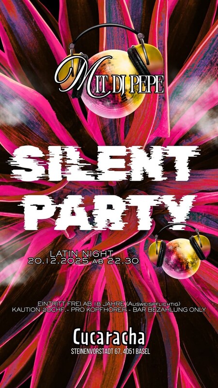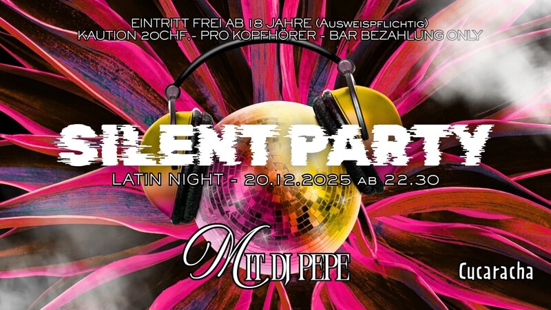 🔥 CUCARACHA LATIN NIGHT – Silent Edition Party mit DJ PEPE 🔥 📅 Samstag, 20. Dezember 2025 Mach dich bereit für ein unvergessliches Wochenende! Erlebe unsere Silent Edition Latin Party mit DJ Pepe – heisse Reggaeton-, Salsa- & Bachata-Beats direkt in deine Kopfhörer! 🎧🔥 Für die Kopfhörer wird eine Kaution von Fr. 20.– (Barzahlung) verlangt – damit geniesst du die volle Sound-Experience. 🍹 Fantastische Cocktails 🍽️ Köstliches Essen 💃 Latin Vibes all night long ⏰ Ab 22:30 Uhr 💸 Eintritt frei!